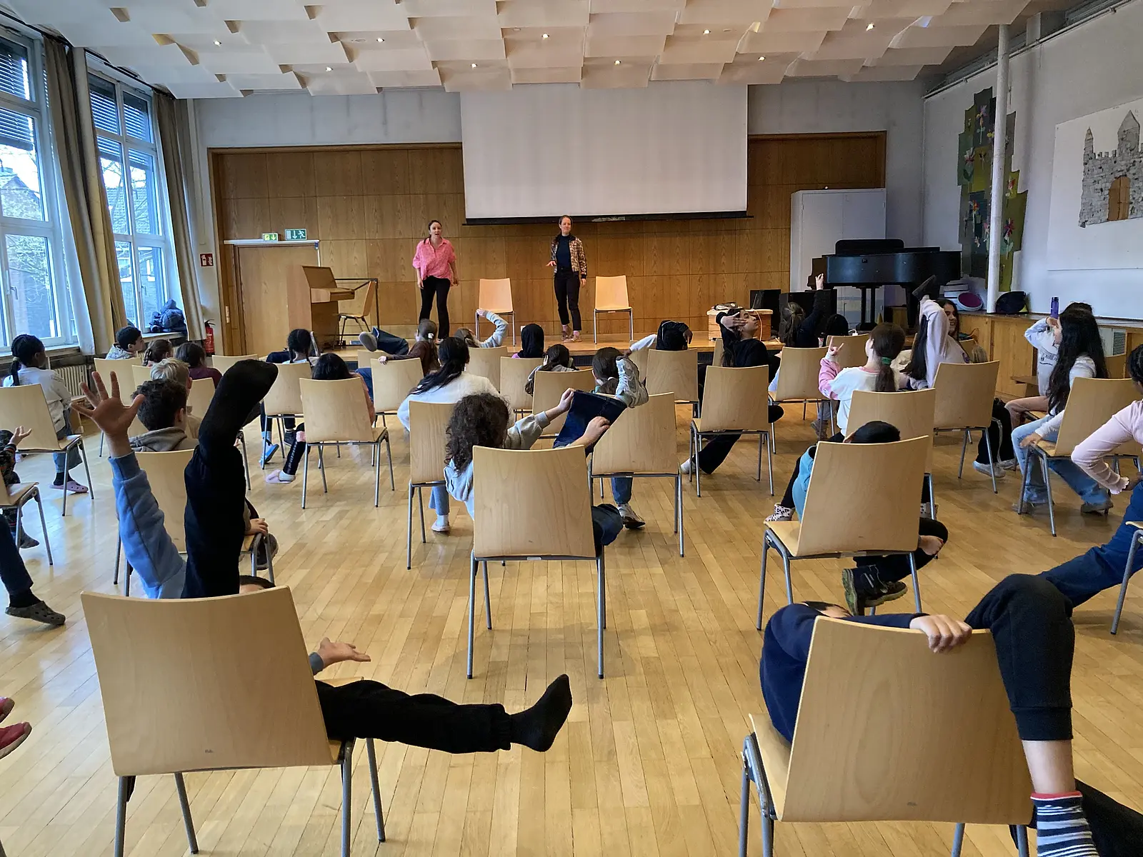 Tanzen auf und mit Stühlen? Dass das geht lernten wir in einer Stunde mit dem Tanzhaus NRW. Eingebettet in eine Phantasiegeschichte erprobten wir verschiedenste Bewegungen zu ganz unterschiedlicher Musik. Mal leise und langsam, mal schnell und laut. Wir konnten selbst Bewegungen erfinden und vormachen. Der ganze Saal ahmte sie nach. Beim Freestylen waren einige Kinder besonders mutig und kreativ. War das tanzen? Irgendwie schon und irgendwie doch ganz anders, als wir es bisher kannten. Wir lernten, dass man mit und durch Tanzen Geschichten erzählen kann. Das war „irgendwie komisch und irgendwie cool.“