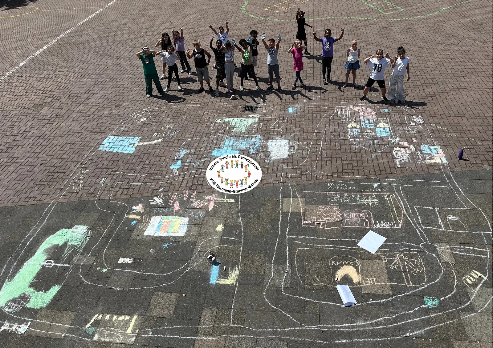 Наприкінці навчального року діти класу 2а на уроках мистецтва працювали над темою «Наша школа як спільнота». Після роздумів про те, що таке спільнота, та малювання місць у її межах, діти вже за півгодини тимчасово зобразили крейдою на шкільному подвір'ї велику мережу вулиць із автобусними зупинками, бібліотеками, футбольними полями, басейнами та ярмарком. У центрі спільноти: наша школа та ті, хто роблять її спільнотою.